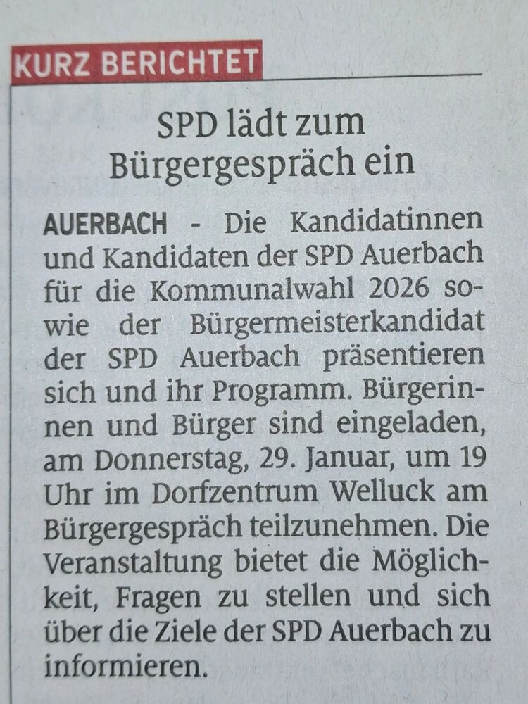 Wir freuen uns über Ihren Besuch. Sie finden hier Ansprechpartner, Termine und Infos zur SPD und unserer Arbeit. Wir bemühen uns um eine ehrliche, bürgernahe Politik für alle Auerbacher Bürger durch eine nachhaltige, zielgerichtete Kommunalpolitik. Dazu möchten wir auch Ihre Meinungen und Wünsche wissen. Wir würden es sehr begrüßen, wenn Sie sich damit an unsere Rats- und Vorstandsmitglieder wenden.