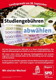 Seit dem Sommersemester 2007 gibt es in Bayern Studiengebühren. Nun zeigt sich: Bildung hängt noch stärker als zuvor vom Geldbeutel der Eltern ab. Wir waren schon immer der Meinung: Studiengebühren sind unsozial, ungerecht, Unsinn. Deshalb wollen wir die Abschaffung nach der Landtagswahl durchsetzen. In Hessen hat die SPD Wort gehalten: Ab dem Wintersemester gibt es keine Studiengebühren mehr – auch keine Langzeit- und Zweitstudiengebühren.