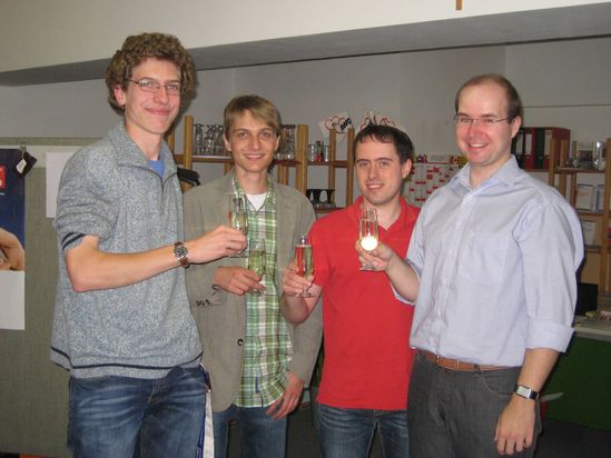 Martin Gebhard, Lukas Lebherz, Andreas Gabler und André Radszun stoßen auf die AG an (von links nach rechts)