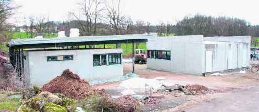 „Wenn uns die Witterung keinen Strich durch die Rechnung macht, beginnen am Donnerstag die Arbeiten an den Außenanlagen mit Auskoffern, Schottern und Pflastern“, berichtete Hofmann. Im Eingangsbereich entstanden zwei eingeschossige Baukörper mit einem dazwischen liegenden Zugang über die alte Wegetrasse. Der Sanitärtrakt bekommt später zukünftig acht Kombi-Duschen mit Umkleide und vier Sammelduschen, -umkleiden und jeweils