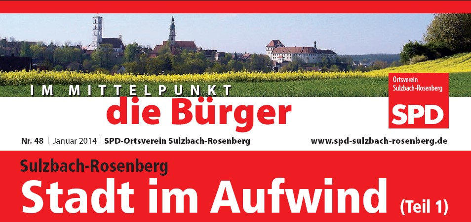 Die Kommunalpolitischen Ziele der SPD werden in zwei Ausgaben kurz vorgestellt. In dieser Ausgabe stehen die Arbeitsplätze, Umwelt + Energie, Freizeit, Straßen + Verkehr, Verwaltung + Finanzen sowie Stadtsanierung in Sulzbach + Rosenberg im Vordergrund. Ausgabe 2 erscheint im Februar!