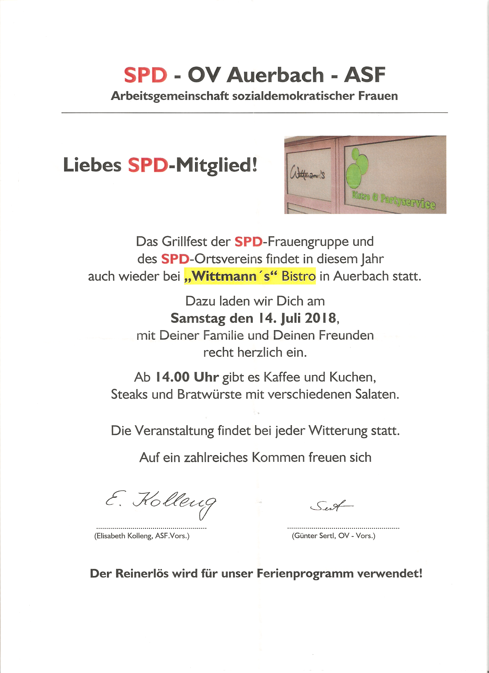 Auf Ihren Besuch freuen sich die SPD und das Team vom Bistro Wittmann