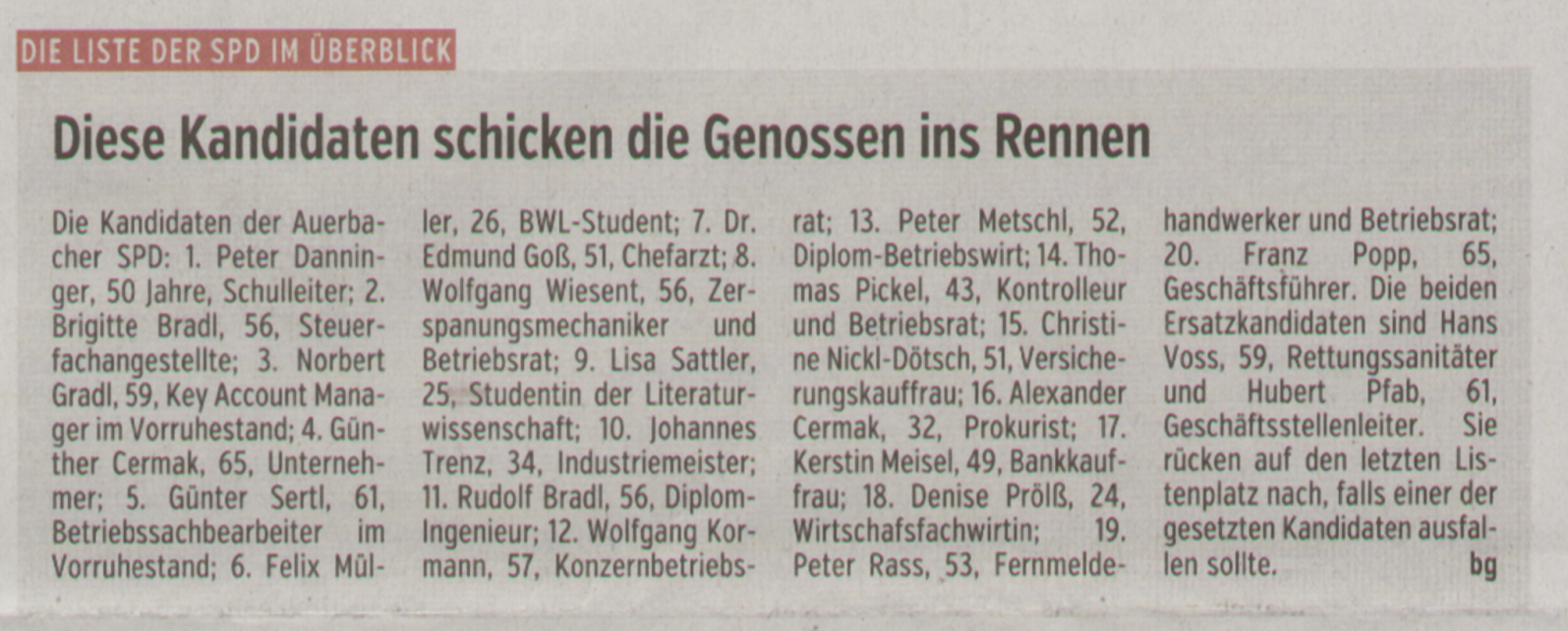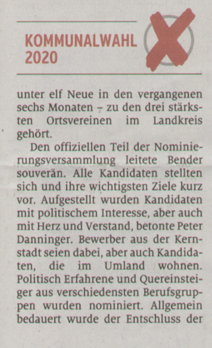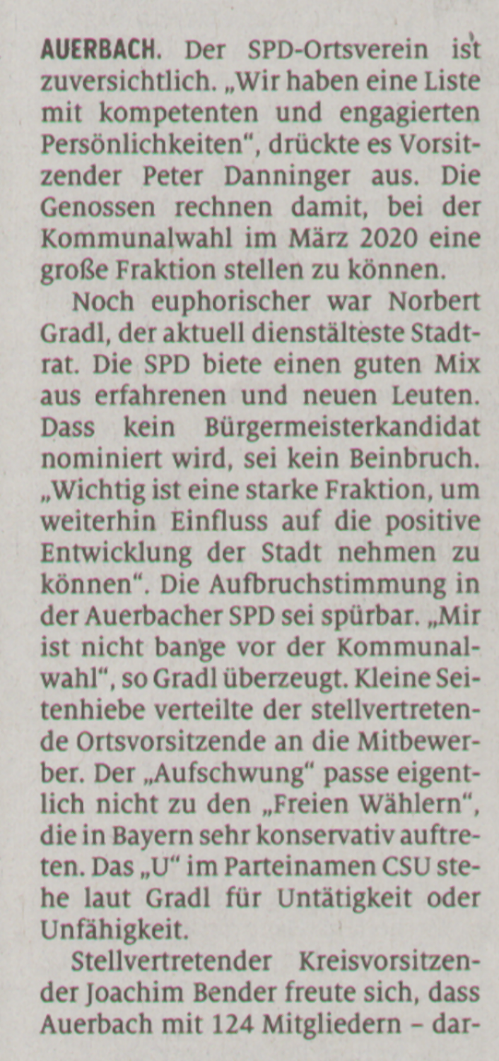 SPD Auerbach nominierte die Kandidaten für die Kommunalwahl 2020. 49 Mitglieder stimmten einstimmig für den SPD-Listenvorschlag ein starker Vertrauensbeweis für die SPD-Vorstandschaft um den Vorsitzenden Peter Danninger.
