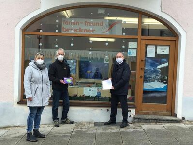Bei der Post überreichten 3. Bürgermeisterin Hildegard Geismann und stellv. OV-Vorsitzender Dr. Thomas Steiner an den Leiter der Postdienststelle, Herrn Manfred Mederer, 40 Brezen, während OV-Vorsitzende Bettina Moser und Vorstandsmitglied Anja Pilhöfer Bierkästen bei den Stadtwerken, der Gärtnerei und dem Bauhof vorbeibrachten.